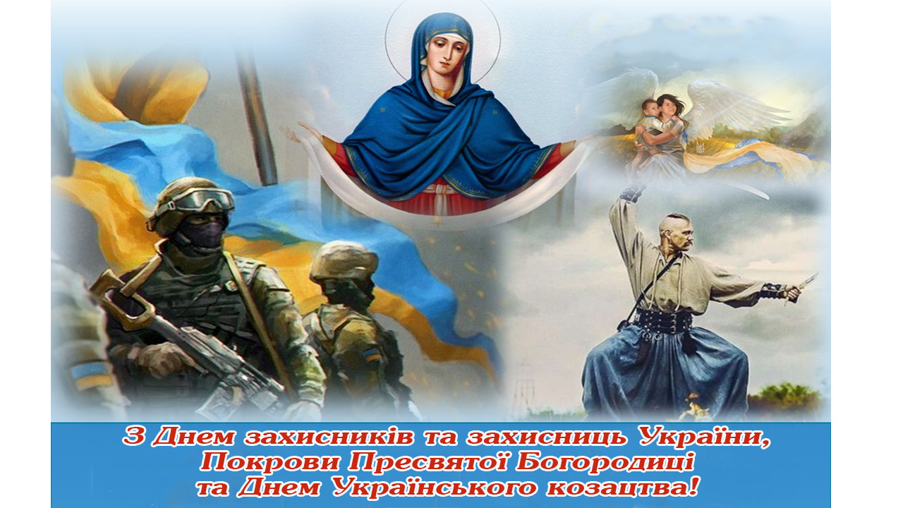 Вітаємо з Днем захисників і захисниць України, світлим святом Покрови Пресвятої Богородиці та Днем українського козацтва! 1 жовтня 2025 року 10:19 - 23:19