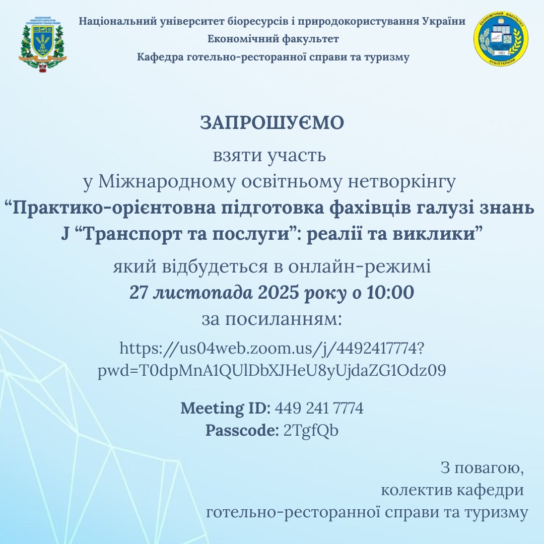 Міжнародний освітній нетворкінг «Практико-орієнтована підготовка фахівців галузі знань J «Транспорт та послуги»: реалії та виклики» 27 листопада 2025 року 10:00 - 22:51