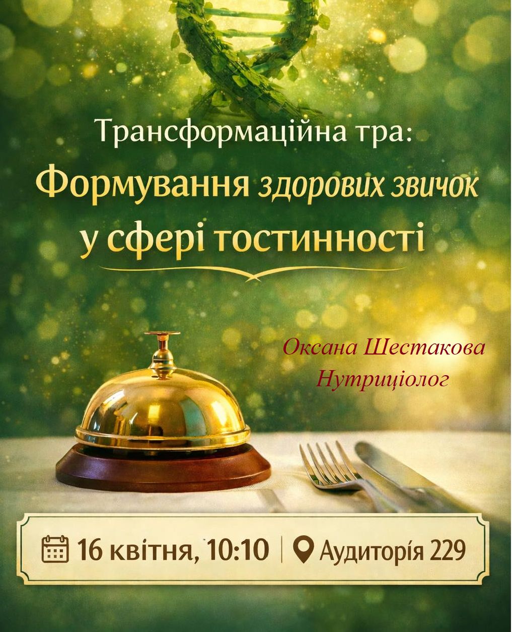 Запрошуємо на гостьову лекцію на тему «Трансформаційна гра: Формування здорових звичок у сфері гостинності 16 квітня 2026 року 10:10 - 23:59