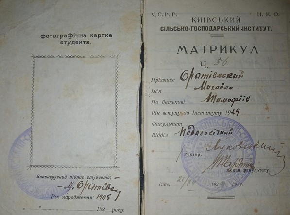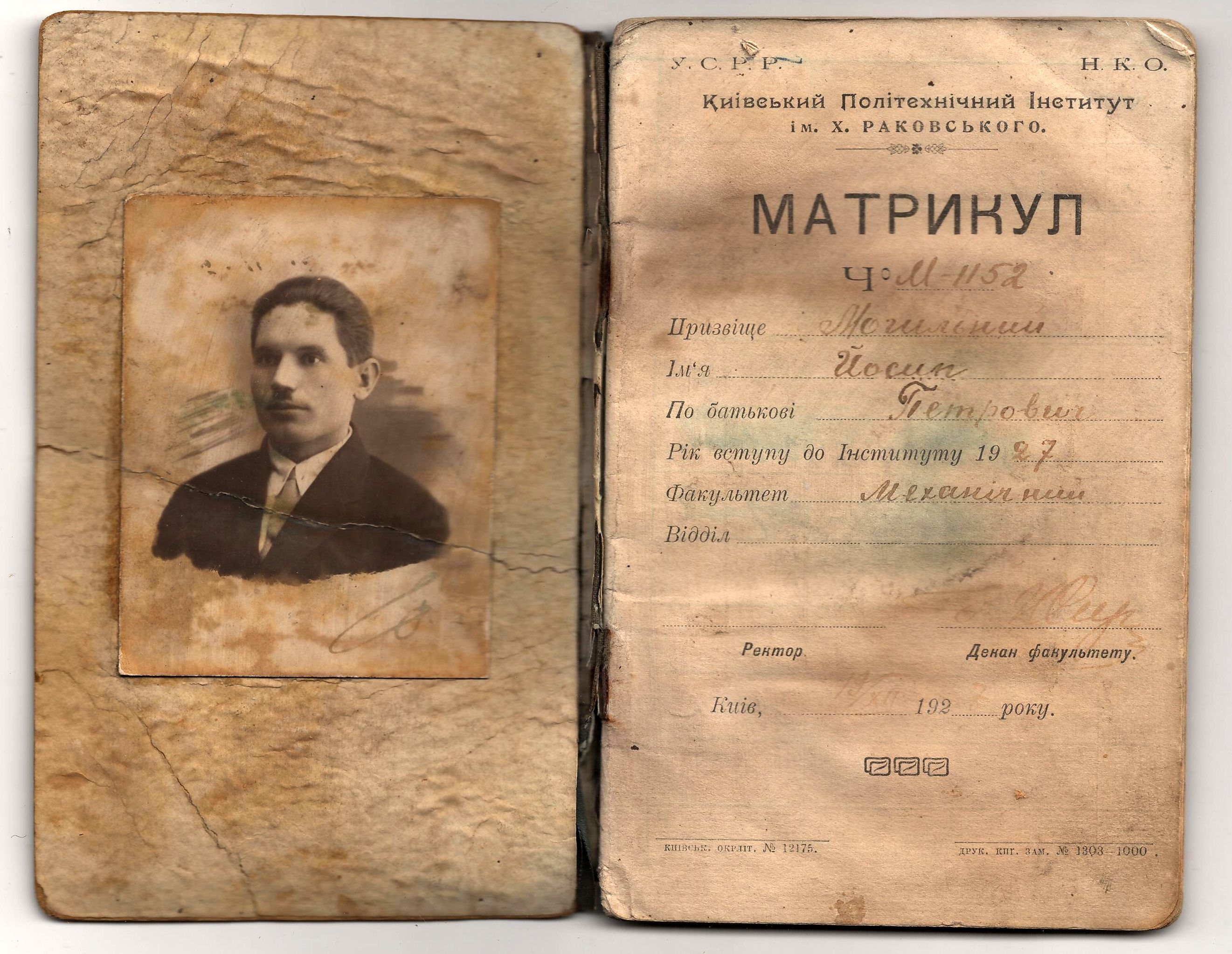Матрикул. Київський сільськогосподарський політехнічний інститут ім. Х. Раковського, механічний факультет.