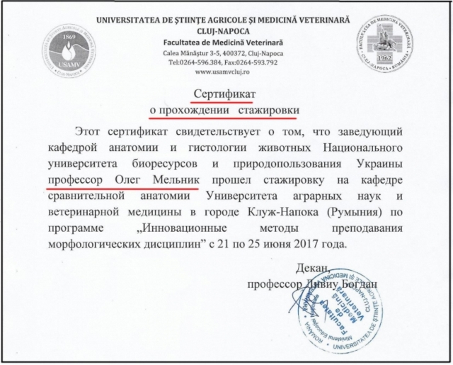 10. 21-25 червня 2017 року стажування в Університеті аграрних наук та ветеринарної медицини в м. Клуж-Напока, Румунія;