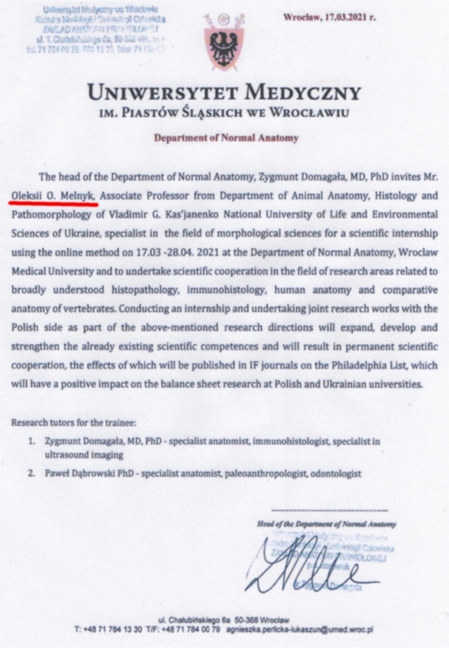 11. З 17 березня по 28 квітня 2021 року пройшов дистанційне стажування у Вроцлавському медичному університеті, м. Вроцлав, Польща;