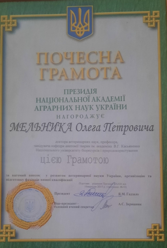 9. Мельник О.П., Мельник О.О., Арнаут Б.М. Патент України на корисну модель № 98063. Спосіб прижиттєвої ангіоінфузії; заявник і патентовласник Національний університет біоресурсів і природокористування України. Заявл. 05.12.2014; опубл. 10.04.2015, Бюл. № 7.
