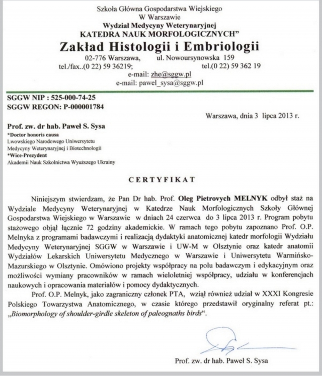 2. З 24 червня по 3 липня 13 року стажування у Головній школі сільського господарства у Варшаві (Варшавський університет наук про життя), м. Варшава Польща;