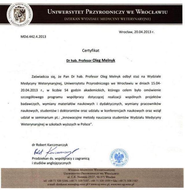 1. 15-20 квітня 2013 року стажування у Вроцлавському природничому університеті, м. Вроцлав, Польща;