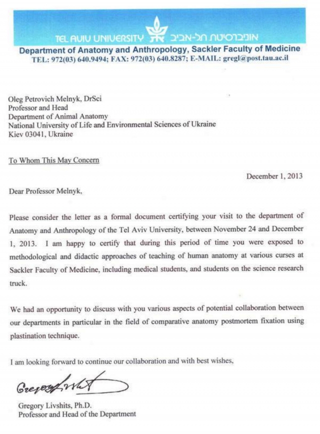 5. З 24 листопада по 1 грудня 2013 року стажування на кафедрі анатомії і антропології Тель Авівського університету, м. Тель Авів, Ізраїль;