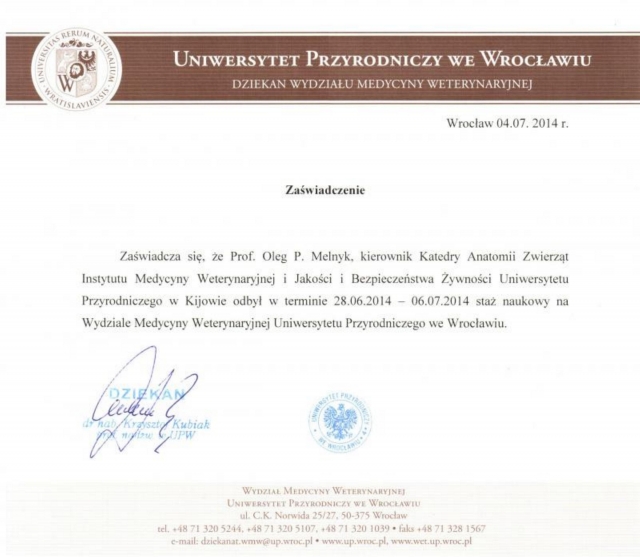 6. З 28.06. по 06.07. 2014 року стажування у Вроцлавському природничому університеті, м. Вроцлав, Польща;