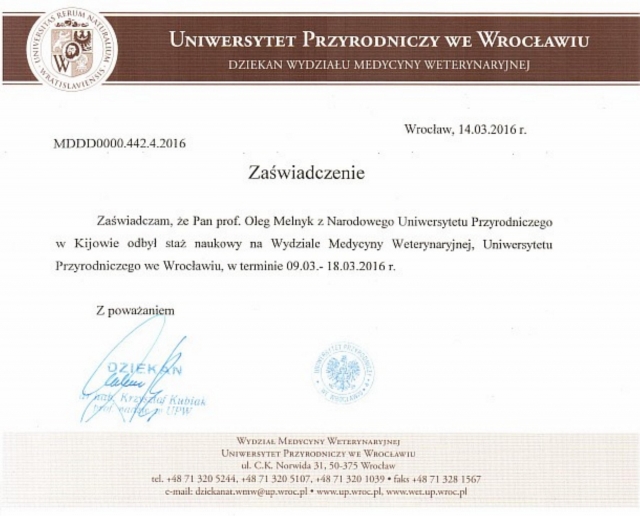 7. 9-18 березня 2016 року стажування у Вроцлавському природничому університеті, м. Вроцлав, Польща;