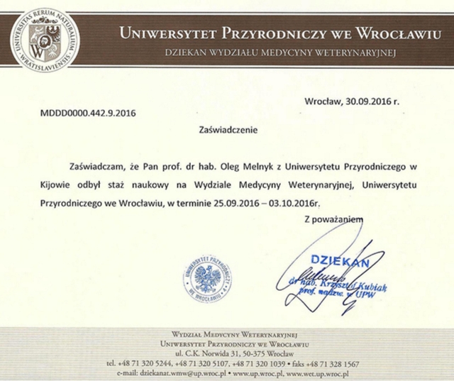 8. З 25 вересня по 3 жовтня 2016 року стажування у Вроцлавському природничому Університеті, м. Вроцлав, Польща;