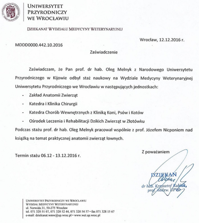 9. 6-13 грудня 2016 року стажування у Вроцлавському природничому університеті, м. Вроцлав, Польща;