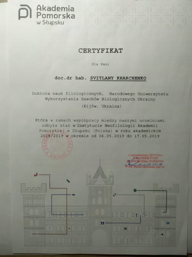 Також члени кафедри періодично здійснюють стажування і в вітчизняних наукових установах: Костриця Н.М – Національний педагогічний університет імені М. П. Драгоманова, Україна (2017 р.), МОН України. Національна комісія зі стандартів державної мови, Україна (2021 р.); Семашко Т.Ф. – Славістичний лінгвістичний центр, Україна (2018 р.), Національний університет біоресурсів і природокористування України, Україна (2021 р.), МОН України. Національна комісія зі стандартів державної мови, Україна (2021 р.); Харченко С.В. – МОН України. Національна комісія зі стандартів державної мови, Україна (2021 р.); Навальна М.І. – Національне агентство із забезпечення якості вищої освіти, Україна (2021 р.), ДВНЗ «Переяслав-Хмельницький державний педагогічний університет імені Григорія Сковороди», Україна (2021 р.), Національний педагогічний університет імені М.П. Драгоманова, Україна (2017-2018 рр.); Вакулик І.І – МОН України. Національна комісія зі стандартів державної мови, Україна (2021 р.); Лягуша А.О. – Національне агентство із забезпечення якості вищої освіти, Україна (2020 р.); Балалаєва О.Ю. – Національний університет біоресурсів і природокористування України, Україна (2016, 2019); Національний педагогічний університет імені М.П. Драгоманова, Україна (2017 р.); Бикова О.М. – Національна академія керівних кадрів культури і мистецтв, Україна (2017 р.); Васьків М.С. – Програма «Викладання дисциплін згідно із сучасними нормативно-правовими вимогами щодо підвищення якості підготовки фахівців», Україна (2017 р.) тощо.
