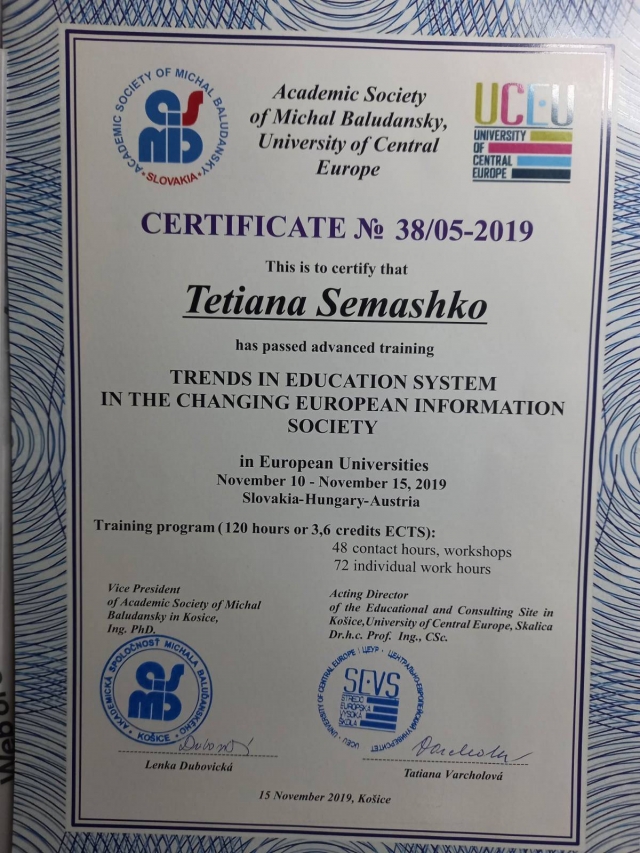 Професорсько-викладацький склад кафедри постійно підвищує свою кваліфікацію шляхом стажування у іноземних ЗВО: Шинкарук В.Д. – Поморська академія, Польща (2020 р.); Семашко Т.Ф. – стажування у європейських університетах, Словаччина-Польща (2019) р.; Харченко С.В. – Поморська академія, Польща (2019 р.); Личук М.І. – стажування у європейських університетах, Словаччина-Польща (2019 р.); Балалаєва О.Ю. – Вища школа менеджменту інформаційних систем Університету прикладних наук, Латвія (2021 р.); Лягуша А.О. – проходження тренінгів на базі Краківського університету, Польща (2018 р.); Добродум О.В. – університет Марії Складовської-Кюрі, Польща (2017 р.), університет прикладних наук та мистецтв, Німеччина (2018 р.), Центральний Інститут іноземних та англійської мов, Індія (2019 р.), наукове стажування Еразмус, Австрія (2019 р.), наукове стажування Еразмус+, Румунія (2020 р.).
