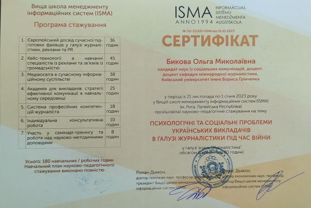 Так, демонструють і підтверджують високий рівень володіння іноземною мовою рівня B1, B2: Семашко Т.Ф. (2019 р.), Харченко С.В. (2020 р.), Навальна М.І. (2021 р.), Добродум О.В. (2018 р.), Балалаєва О.Ю. (2020 р.) та беруть участь у міжнародних проєктах (Шинкарук В.Д. – участь у Міжнародному науковому проєкті «Оцінка системи моніторингу якості освіти в Україні», Навальна М.І. – участь у німецько-українському проекті «Цінності інклюзивної освіти – в діалозі професіоналів» (Магдебург, Німеччина), Лягуша А.О. – учасник Reuters Journalism training program «Writing Financial and Business News (Лондон, Англія); стипендіат програми «Україна в Європейському діалозі» (Інститут гуманітарних наук, м. Відень, Австрія); викладають у закордонних ЗВО: Лягуша А.О. – запрошений професор-дослідник Університету Джорджа Мейсона (Вашингтон, США).