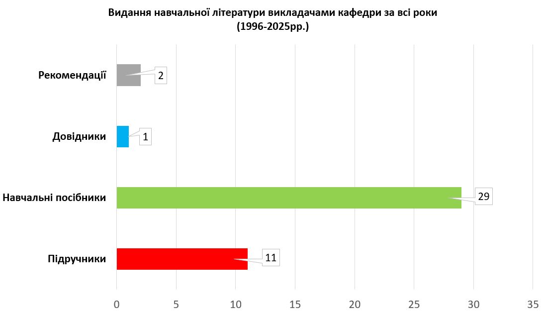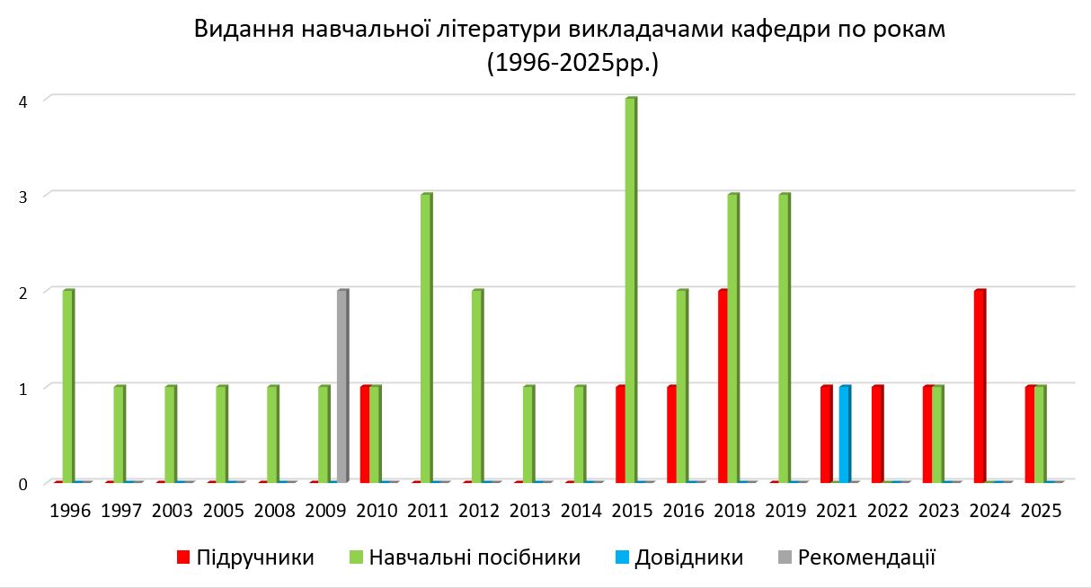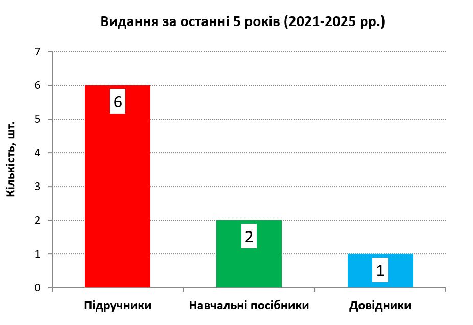 За останні 5 років (2021-2025) фахівцями кафедри видано 6 підручників, 2 навчальних посібники та 1 довідник.