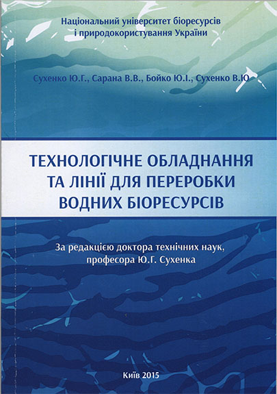 - Технологічне обладнання та лінії для переробки водних біоресурсів / Ю.Г. Сухенко, В.В. Сарана, Ю.І. Бойко, В.Ю. Сухенко, навч. посіб. / За ред.. проф. Ю.Г. Сухенка. – К.: ЦП «Компринт», 2015. – 253.