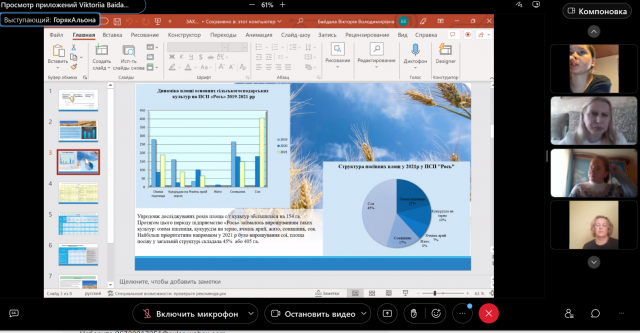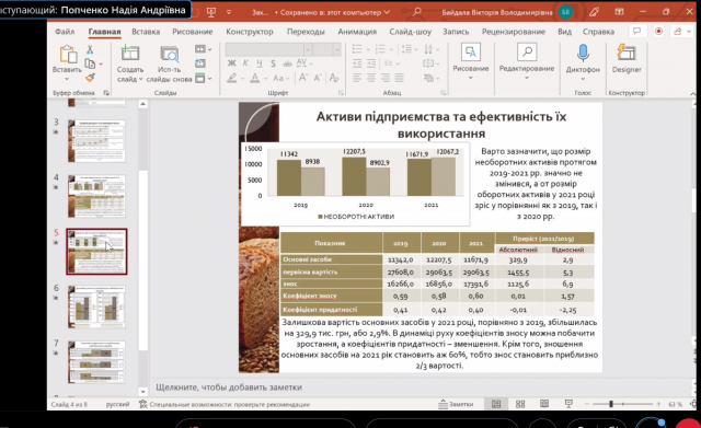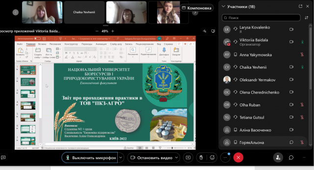 По-першому питанню слухали студентів ОС Магістр спеціальності 051 Економіка денної форми навчання за освітньою програмою «Економіка підприємства» щодо захисту звітів з виробничої практики: Васюченко Аліну, Горяк Альону, Лісову Анастасію, Педоряка Анастасію, Чайка Євгенія, Попченко Надію, Слободяник Дарію, Степанисько Ярослава. Студенти надали змістовні звіти-презентації, в яких було наведено характеристику підприємства, проведення економічного аналізу і оцінка результатів діяльності підприємств, виявлення факторів, які позитивно чи негативно вплинули на кінцеві показник роботи підприємства.
