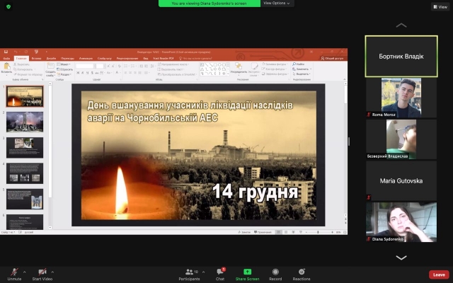 На гуманітарно-педагогічному факультеті НУБіП України в рамках культурно-виховної роботи кафедри міжнародних відносин і суспільних наук у групах МВ-21001б, МВ-19003б було зорганізовано тематичний інформаційний захід до Дня вшанування учасників ліквідації наслідків аварії на ЧАЕС. Студенткою Діаною Сидоренко було підготовлено презентацію «Ліквідатори Чорнобильської катастрофи».