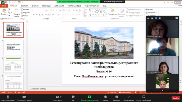 15 вересня 2022 року відбулася відкрита лекція професора Бандури В.М. з дисципліни «Устаткування закладів готельно–ресторанного бізнесу» на тему «Подрібнювальне і різальне устаткування» для студентів 3 курсу спеціальності «Готельно–ресторанна справа» ННІ неперервної освіти і туризму.