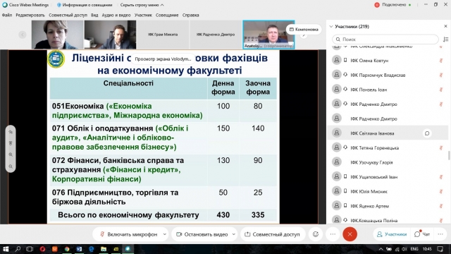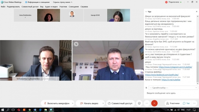Після цього для абітурієнтів гостинно відкрив віртуальні двері економічний факультет. Більше 200 майбутніх абітурієнтів та їх батьків мали можливість в режимі реального часу поспілкуватися з керівництвом факультету і кафедр, поставити свої запитання.