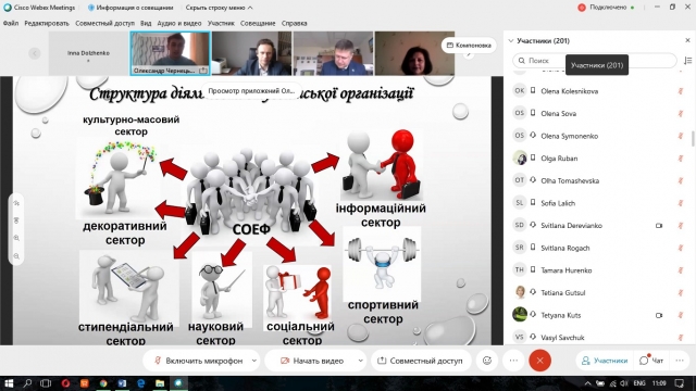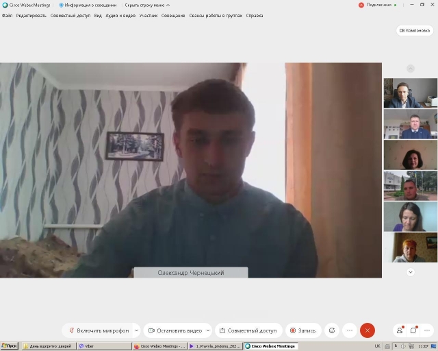 Він розповів яким чином відбувається навчання на факультеті, про навчальні аудиторії і лабораторії. Але основний акцент у свої розповіді Олександр зробив на напрямках роботи студентської організації, проведенні дозвілля студентів, та як вони працюють під час пандемії.