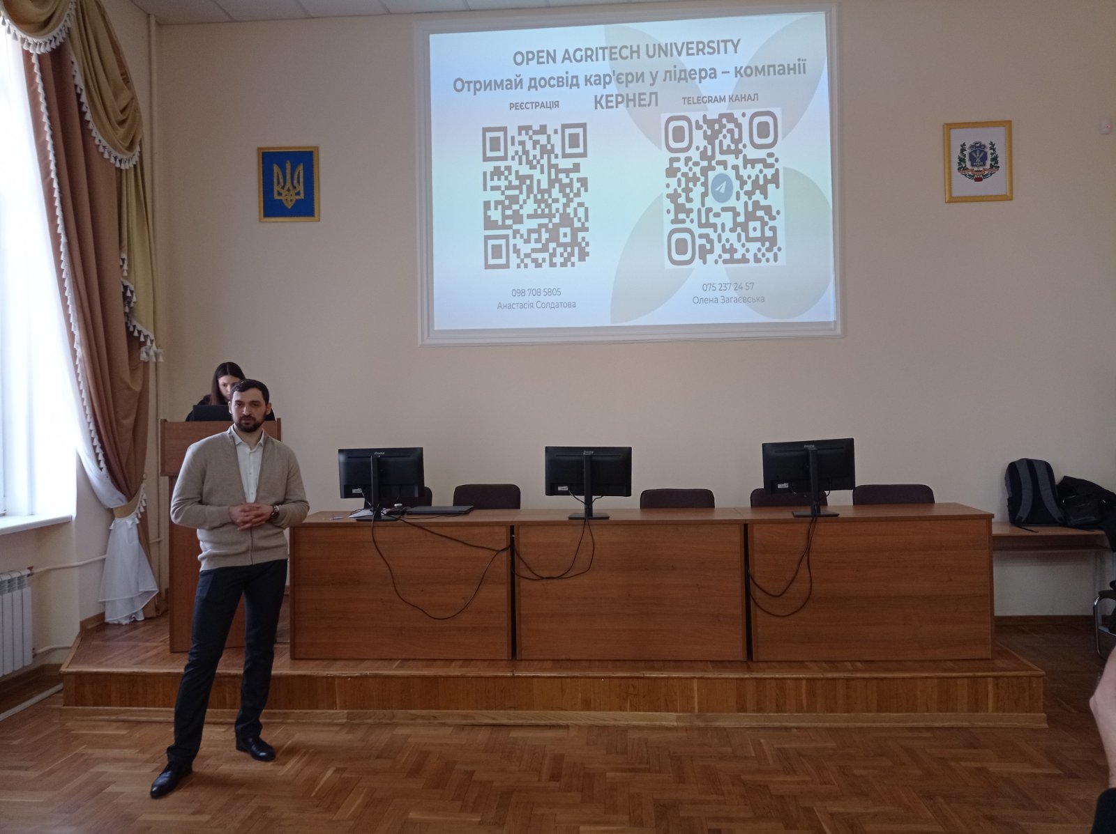 Окрему увагу спікер приділив тому, як студентам успішно пройти навчання в межах програми та отримати можливість працевлаштування в компанії. Також він розповів про розвиток і успіхи компанії, ознайомив присутніх із діяльністю переробних заводів Kernel, їхніми потужностями та роллю в аграрному секторі України та світу.