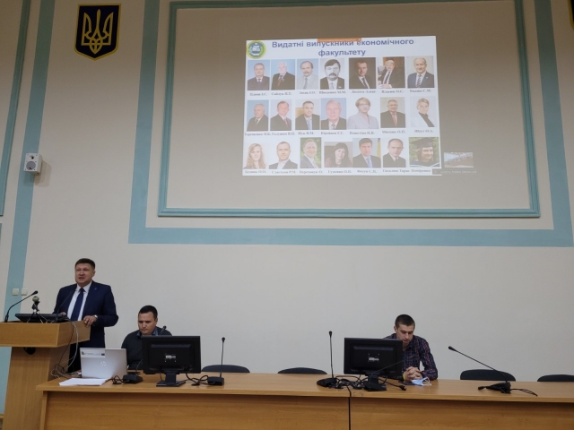 Після урочистих заходів на стадіоні, вже у стінах економічного факультету, декан Анатолій Діброва презентував економічний факультет, його історію, можливості та переваги навчання, зв’язки факультету з іншими вузами, зарубіжними партнерами, співпрацю з радою роботодавців.