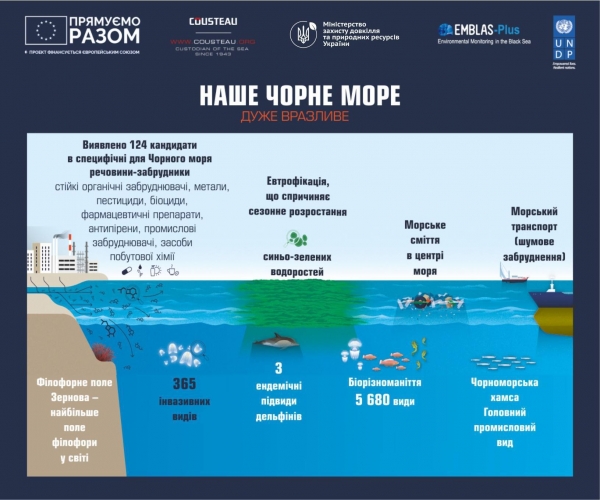 Завдяки проєкту ЄС-ПРООН «Посилення екологічного моніторингу Чорного моря» (EMBLAS) з’ясувалось, що Чорне море досить забруднене сміттям: 83% морського сміття, знайденого в Чорному морі, складає пластик, а саме PET-пляшки, упаковка, пластикові пакети; Дунай та Дністер несуть в море від 6 до 50 одиниць сміття на годину; кількість морського сміття в Чорному морі майже вдвічі перевищує аналогічну цифру для Середземного моря (https://mepr.gov.ua/news/36159.html). Охорона морських екосистем включена до екологічного блоку Угоди про асоціацію Україна-ЄС. Наразі Україна впроваджує положення Рамкової Директиви ЄС про морську стратегію, головною метою якої є поетапне досягнення гарного екологічного стану морського середовища. Одним з першочергових кроків на цьому шляху є впровадження оновленої системи екологічного моніторингу, який охоплюватиме усі показники гарного екологічного стану, зазначені в Директиві.