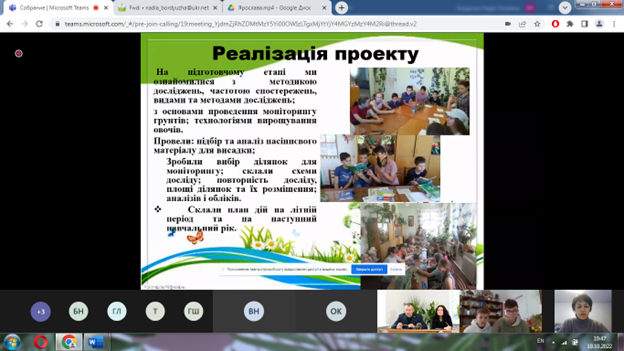Потім перейшли безпосередньо до роботи. Учні демонстрували свої науково-дослідні роботи, у яких вони вивчали дію органічних і мінеральних добрив на технічні, зернові і овочеві культури, а також ефективність використання добрив нового покоління на основі амінокислот, фітогормонів, цукрів, біодобрив тощо. Частина робіт була присвячена вивченню густоти стояння рослин, а також відзивчивості різних гібридів на добрива. Активно і досить професійно відповідали на питання членів журі.
