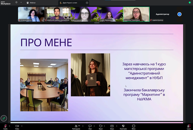 Цікавою частиною зустрічі були виступи студентки Христини ПЛАХОТНЮК, яка нині є практиканткою компанії "Байєр" і Марії БЄЛОЗЄРСКІХ, яка є випускницею ОП "Адміністративний менеджмент" 2025 року, а зараз працює в компанії "Галс Агро".