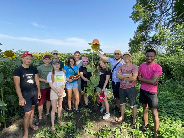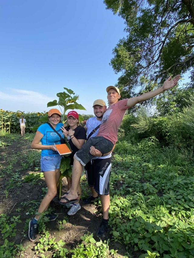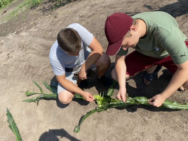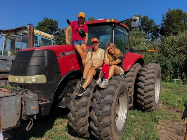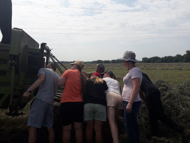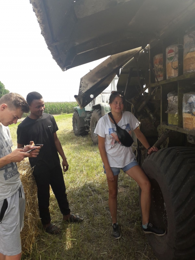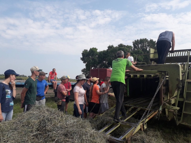 Працюючи в полях, паралельно знайомилися з технологічними процесами. У перший же день стали свідками збирання люцерни на сіно. Працівники люб’язно показали агрегат для тюкування сіна, розповіли про його роботу.