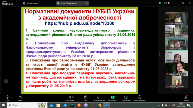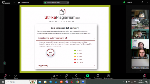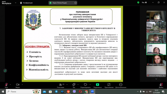 Жвава дискусія виникла при обговоренні питання використання штучного інтелекту при написанні наукових робіт. Тетяна Степанівна ознайомила студентів з Положенням про політику використання штучного інтелекту в НУБіП України.