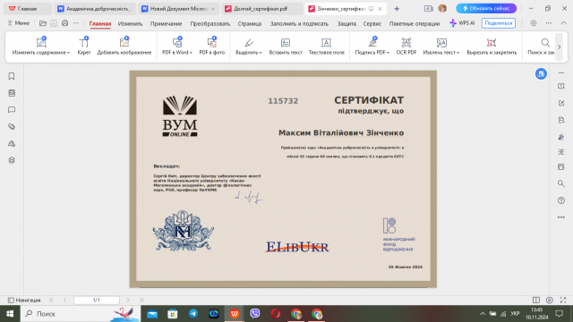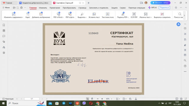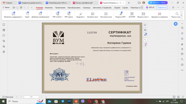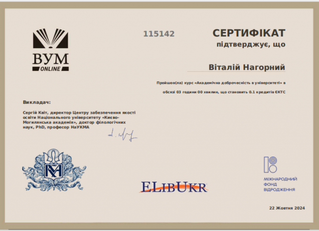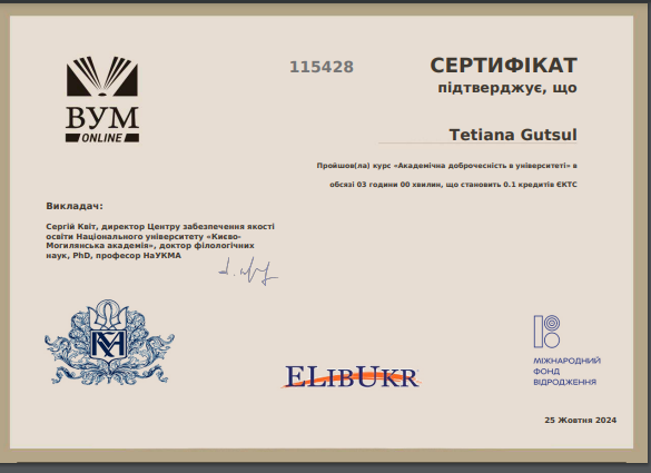 З метою закріплення отриманої інформації, лектор навчального курсу «Методологія і організація наукових досліджень з основами інтелектуальної власності» д.е.н., професор кафедри економіки Тетяна Мірзоєва запропонувала здобувачам вищої освіти освітньо-професійної програми «Економіка підприємств» другого магістерського рівня пройти онлайн курс «Академічна доброчесність в університеті», який дозволить їм удосконалити свої знання про теоретичні аспекти академічної доброчесності та фактори, які впливають на культуру академічної доброчесності здобувачів вищої освіти; навчитися застосовувати теоретичні знання на практиці.