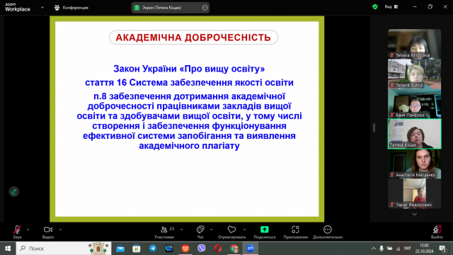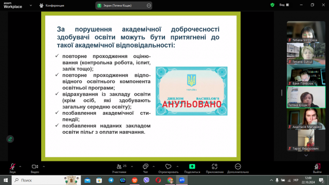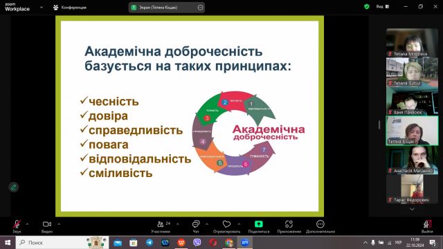 Тетяна Степанівна детально розкрила сутність фундаментальних цінностей академічної доброчесності, таких як чесність, довіра, справедливість, повага відповідальність. В ході проведеної лекції здобувачі освітнього ступеня магістр дізналися що таке академічна доброчесність та плагіат, як уникнути плагіату, як створюється доброчесне середовище в університеті.