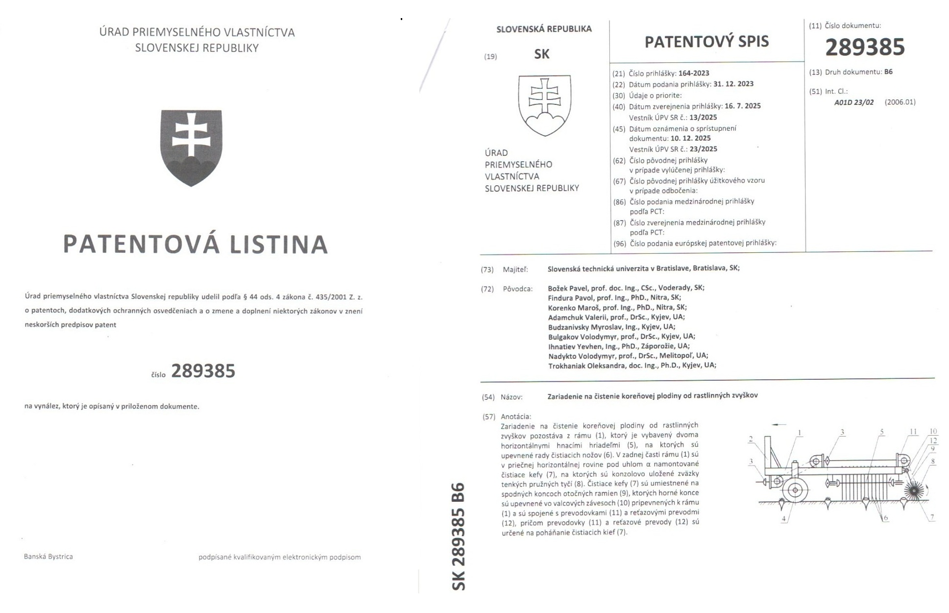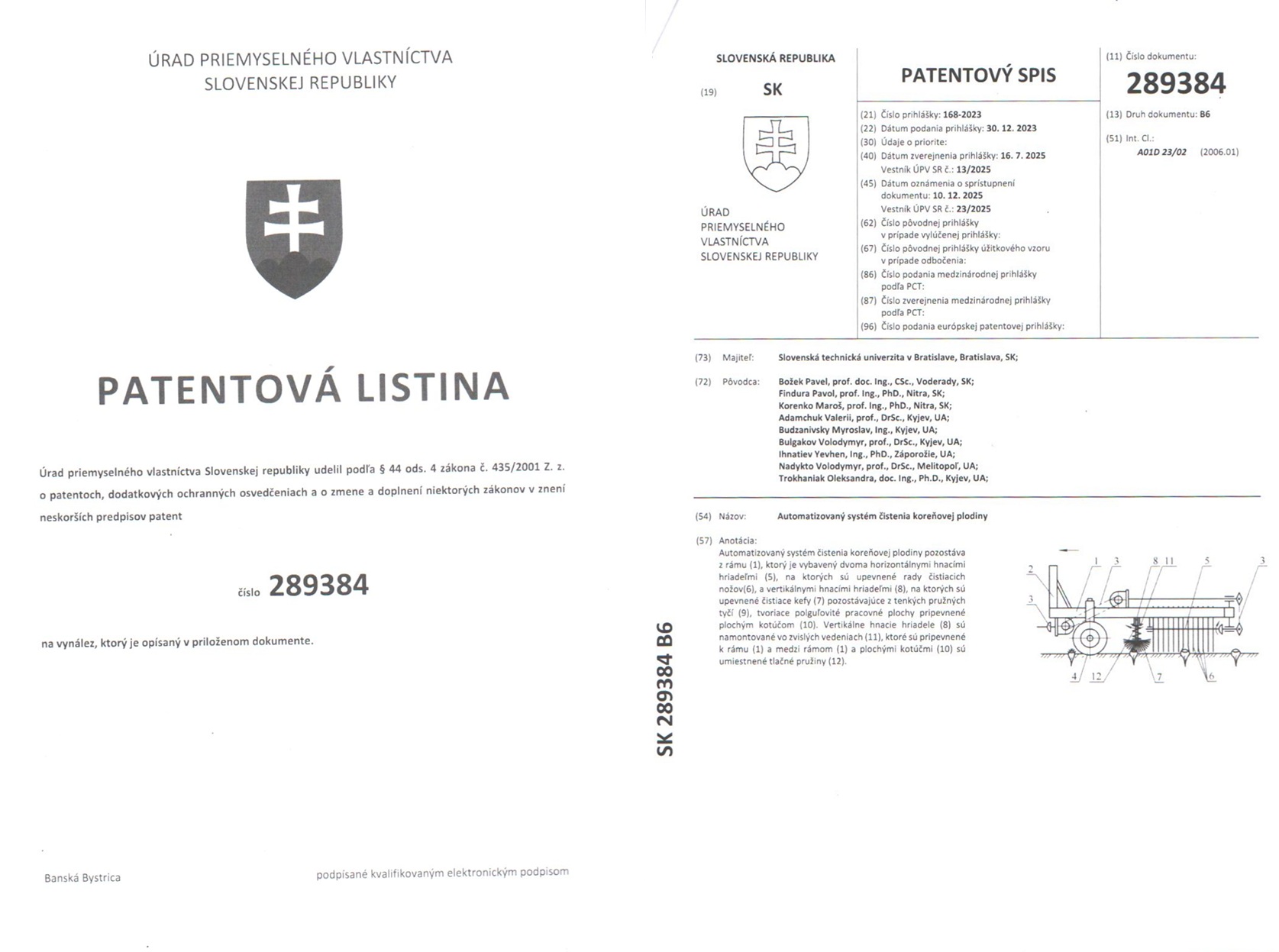 В доробку наукової школи академіка НААН, завідувача кафедри механіки Національного університету біоресурсів і природокористування України Володимира БУЛГАКОВА варто відзначити вірчі звитяги, а саме отримання підтвердження двох патентів на винахід у Словацькій Республіці в грудні 2025 року, що є надзвичайно актуальним для вченого з України в умовах глобалізації науки та інновацій. Словаччина як держава-член Європейського Союзу забезпечує доступ до спільного європейського ринку, що відкриває широкі можливості для комерціалізації розробок. Патентний захист гарантує правову охорону інтелектуальної власності, підвищує інвестиційну привабливість проєктів і сприяє міжнародному науковому співробітництву. Для українського дослідника це також крок до інтеграції в європейський науковий простір, розширення партнерства і зміцнення конкурентоспроможності власних технологій на міжнародному рівні.