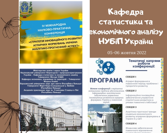 05-06 жовтня 2022 р. на кафедрі статистики та економічного аналізу НУБіП України відбулася IV Міжнародна науково-практична конференція «Стратегія інноваційного розвитку аграрних формувань України: аналітико-прогнозний аспект».