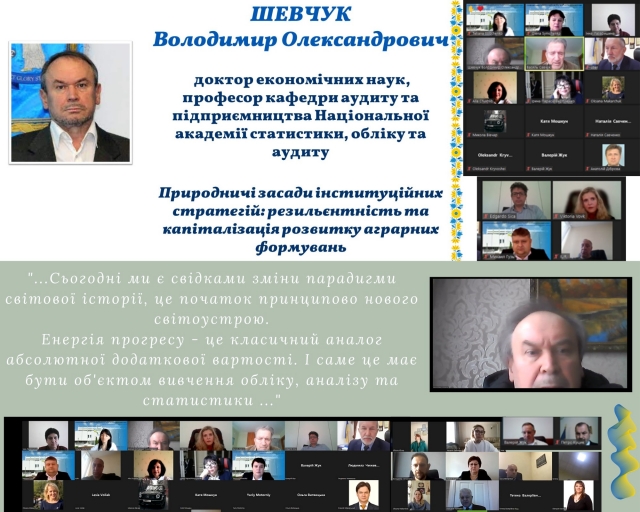 Професор кафедри аудиту та підприємництва Національної академії статистики, обліку та аудиту, д.е.н., професор Шевчук В.О. охарактеризував сучасні підходи до природничих засад інституційних стратегій у розрізі резильєнтності та капіталізації розвитку аграрних формувань. А також запросив до дискусії присутніх щодо необхідності утвердження властивих Україні інтелектуальних можливостей за відповідними науковими, освітніми та прикладними напрямами розвитку, адже адекватні сучасним викликам рятівні сенси властиві якраз українському сегменту загальнолюдського економічного знання.