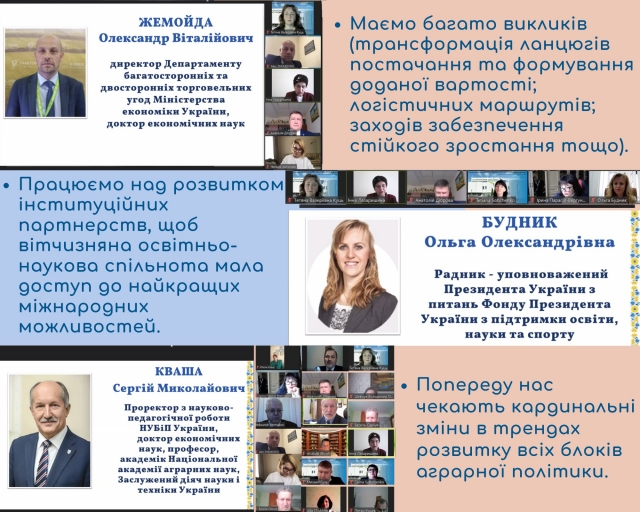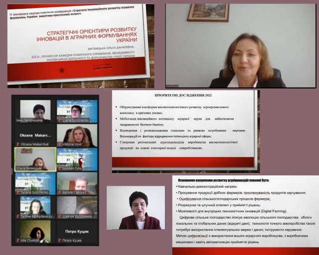 Виступ професора кафедри публічного управління, менеджменту інноваційної діяльності та дорадництва НУБіП України, д.е.н. Витвицької О.Д. був присвячений стратегічним орієнтирам розвитку інновацій в аграрних формуваннях України та висвітленню місії університетів у поширенні інновацій у сучасних умовах. У продовження обговорення стратегій розвитку вітчизняного аграрного сектору, професор кафедри статистики Савчук В.К. деталізував пріоритетні напрями його відновлення в сучасних умовах обмеженості економічних та фінансових ресурсів.