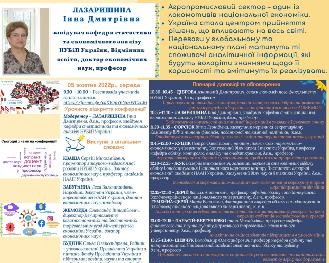 На конференції було обговорено актуальні проблеми удосконалення інформаційно-аналітичного забезпечення управління інноваційним розвитком аграрних формувань України в сучасних умовах. Наукова дискусія відбувалася за наступними тематичними напрямами: аграрні формування в повоєнний період: проблеми і пріоритети розвитку; інформаційно-інноваційне забезпечення управління стратегічним розвитком в умовах повоєнної стабілізації; аналітико-прогнозні тренди соціально-економічного розвитку аграрних формувань в Україні й у світі; фінансове забезпечення повоєнного відновлення інноваційного розвитку суб’єктів господарювання. Модератором заходу була д.е.н., професор, завідувач кафедри статистики та економічного аналізу НУБіП України Лазаришина Інна Дмитрівна.