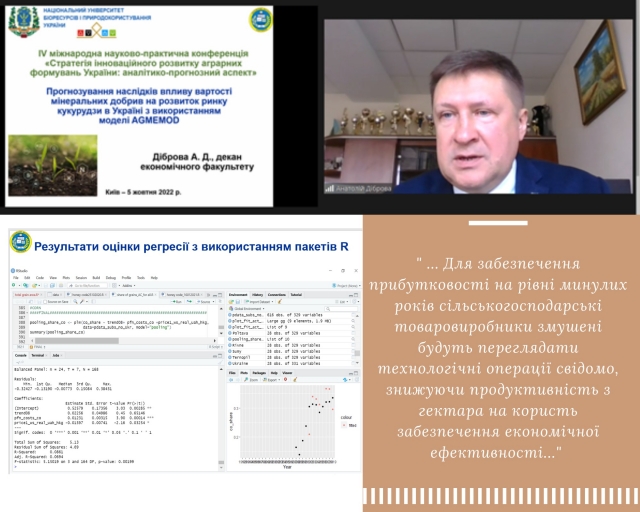 Протягом пленарного засідання конференції були представлені змістовні доповіді за тематикою конференції. Декан економічного факультету, професор Діброва А.Д. презентував результати дослідження щодо прогнозування наслідків впливу вартості мінеральних добрив на розвиток ринку кукурудзи в Україні з використанням моделі AGMEMOD.