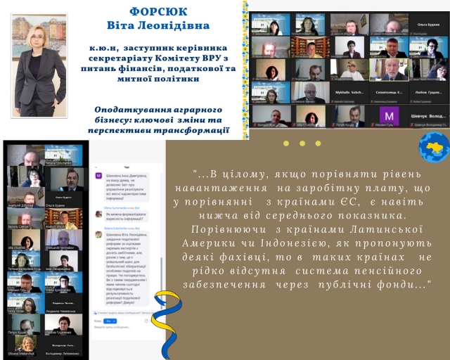Продовжуючи обговорення переорієнтації інформаційно-аналітичного забезпечення концептуальних засад державного управління, заступник керівника секретаріату Комітету ВРУ з питань фінансів, податкової та митної політики, к.ю.н. Форсюк В.Л. прокоментувала основні зміни і перспективи трансформації оподаткування аграрного бізнесу.