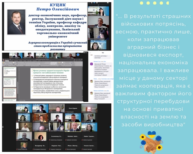 Ректор Львівського торговельно-економічного університету, д.е.н., професор Куцик П.О. виділив основні тенденції та пріоритети розвитку аграрної кооперації в Україні. Петро Олексійович наголосив, що в сьогоднішніх умовах кооперативи, як особлива форма господарської діяльності, мають унікальну соціально-економічну природу, що базується на ідеї економічної самодопомоги широких верств населення з метою самозабезпечення необхідними товарами та послугами.