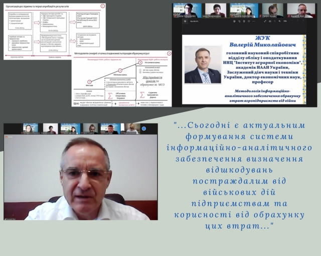 Головний науковий співробітник відділу обліку і оподаткування ННЦ "Інститут аграрної економіки", академік НААН України, д.е.н., професор Жук В.М. розглянув особливості методології інформаційно-аналітичного забезпечення обрахунку втрат агропідприємств від війни. Валерій Миколайович зауважив, що повномасштабна війна наносить як пряму шкоду, так і непрямі збитки усім суб’єктам господарювання України. І саме обрахунки цих збитків та їх фіксації на відповідних державних ресурсах є нагальною потребою керівників, бухгалтерів та економістів підприємств.