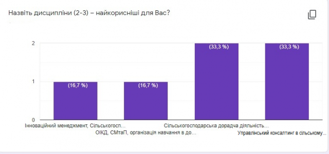 3) Здобувачі ОС «магістр» ОП «Дорадництво» виділили декілька найкорисніших для них навчальних дисциплін з освітньої програми: Сільськогосподарська дорадча діяльність, Управлінський консалтинг в сільському господарстві, а також Інноваційний менеджмент, Організація інформаційно-консультаційної діяльності, Статистичне моделювання та прогнозування, Організація навчання в дорадництві та Аграрна політика.