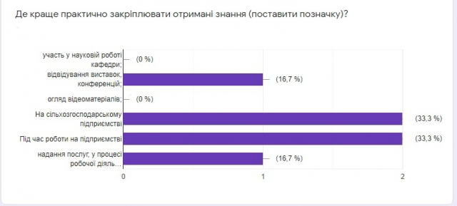 Рис. 4. Діаграма відповідей на питання «Де краще практично закріплювати отримані знання?» наданих здобувачами ОС «магістр» ОП «Дорадництво»