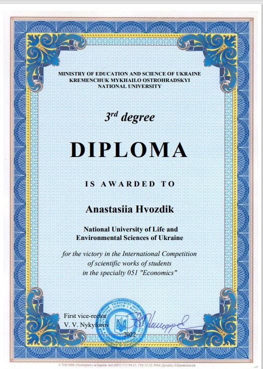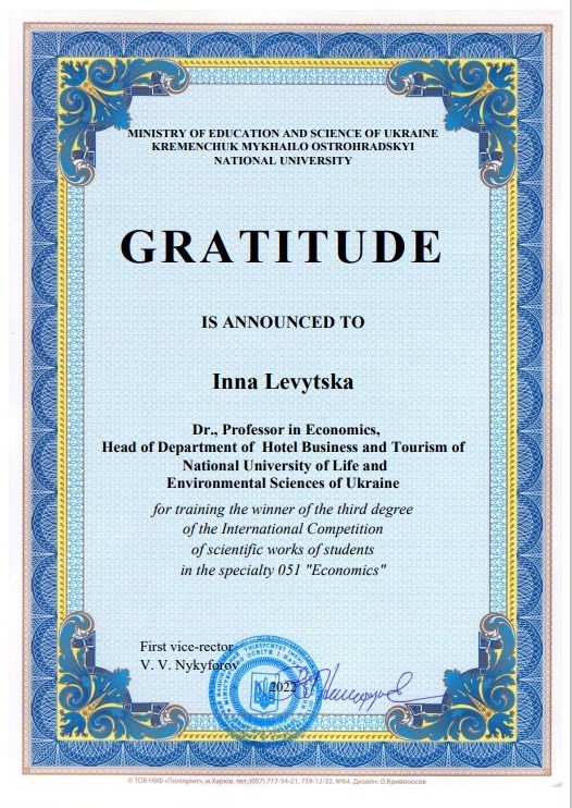 У Кременчуцькому національному університеті ім. М. Остроградського відбувся фінал Міжнародного конкурсу студентських наукових робіт, який проходить вже 5 років поспіль за підтримки Міністерства освіти і науки України. Міжнародний конкурс студентських наукових робіт проводиться з метою інтеграції України в європейський освітньо-науковий простір, задля розширення міжнародних зв’язків, стимулювання інноваційної діяльності студентів, оволодіння ними сучасними технологіями, заради створення умов для формування інтелектуального потенціалу талановитої молоді. Для участі в Конкурсі було надіслано 437 наукових робіт із 28 країн світу, до заходу долучився 141 заклад вищої освіти – 73 українських ЗВО та 68 іноземних. За результатами рецензування конкурсних робіт Галузевою конкурсною комісією сформовано їх рейтинговий список, згідно якого на підсумкове засідання, яке відбулось в DC-офісі університету був запрошений 31 конкурсант, які представляли результати своїх наукових досліджень та відповідали на запитання членів Конкурсної комісії в дискусійному форматі. Національний університет біоресурсів і природокористування України на даному конкурсі представляла Анастасія Гвоздік, здобувач ОС «Магістр» 1 року навчання спеціальності 073 «Менеджмент» освітньо-професійної програми (ОПП) «Управління туристичним та готельно-ресторанним бізнесом», з науковою роботою на тему «Діагностика кризового стану закладів ресторанного господарства», яка виконувалась. Науковий керівник – зав. кафедри готельно-ресторанної справи та туризму Левицька І.В., д.е.н., професор.