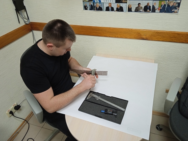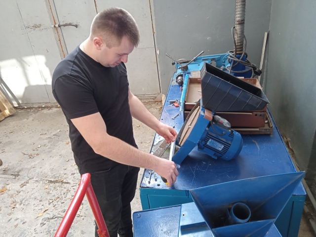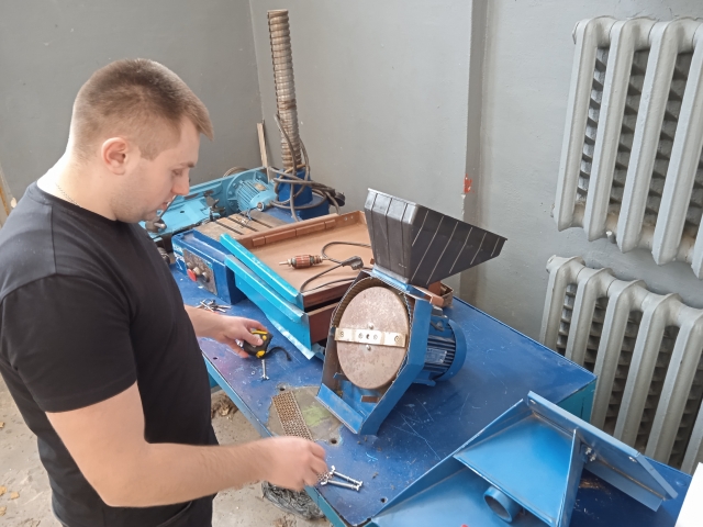 Аспірант освітньо-наукової програми "Галузеве машинобудування" третього освітного ступеня вищої освіти спеціальності 133 "Галузеве машинобудування" Вадим ГРИЦЮК проводить укомплектування, налаштування та виміри до експериментального зразка подрібнювача рослинних матеріалів.