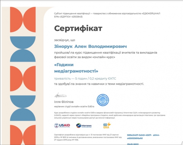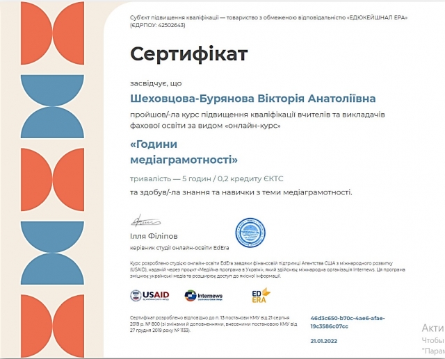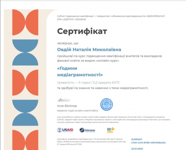 Аспіранти гуманітарно-педагогічного факультету спеціальностей 011 «Освітні, педагогічні науки», 015 «Професійна освіта», 032 «Історія та археологія», 033 «Філософія», 053 «Психологія» прослухали онлайн-курс «Години медіаграмотності».
