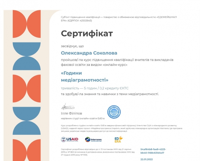 Курс «Години медіаграмотності» розроблено студією онлайн-освіти EdEra завдяки фінансовій підтримці Агентства США з міжнародного розвитку (USAID), що була надана через проєкт «Медійна програма в Україні», який виконується міжнародною організацією Internews. Ця програма зміцнює українські медіа та розширює доступ до якісної інформації.