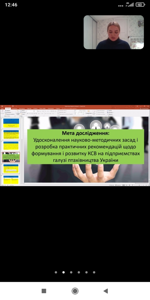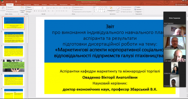 Другим питання порядку денного було заслуховування звіту про наукову роботу аспіранта кафедри маркетингу та міжнародної торгівлі Оваденко Вікторії на тему "Маркетингові аспекти корпоративної соціальної відповідальності підприємств галузі птахівництва", науковий керівник професор Збарський В.К. Представлена презентація, наукові досягнення та виступ здобувача викликали зацікавленість та жваве обговорення, адже обрана тема, предмет та об'єкт дослідження є надзвичайно цікавими та актуальними особливо в період військових дій та важливості соціально-відповідальної діяльності бізнесу. За результатами отриманих відповідей та обговорення прийнято рішення затвердити звіт та допустити до подальшого проходження процедури захисту дисертаційного дослідження відповідно до вимог атестації.