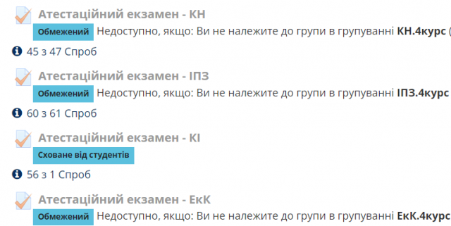 Для проведення екзаменів в дистанційному форматі на платформі https://elearn.nubip.edu.ua для кожної спеціальності відповідно до затвердженої програми був створений тест. Кожне тестове завдання складалося із питань, які за ступенем складності поділені на три частини (базовий рівень, середній рівень та високий рівень, що включає відкриті питання та практичні завдання.)